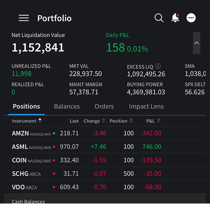 Monitor available funds, margin requirements, excess liquidity, and SMA across multiple accounts. Real-time updates help you make informed allocation and trading decisions.